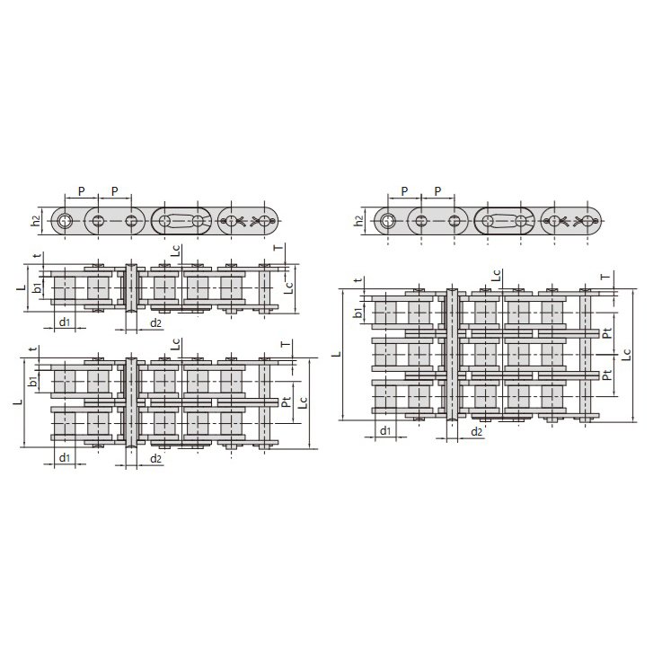 - Struktur fleksibel dengan pelat tautan dalam, pelat tautan luar, pin, selongsong, dan rol untuk kinerja optimal.