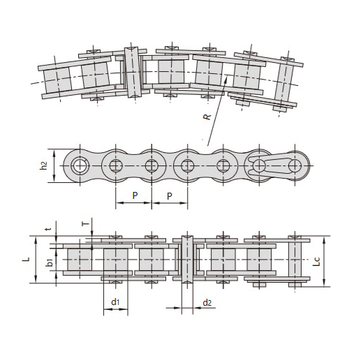 - Struktur Bending Khusus:Dirancang untuk menjaga integritas dan fleksibilitas rantai saat melewati kurva dan belokan, dengan radius R yang lebih kecil dari radius lintasan peralatan yang sesuai.